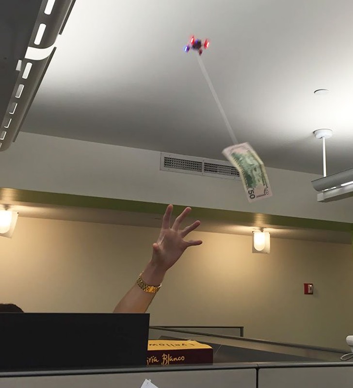 A worker at the office shouted that anyone could get this $50 as he would make the bill pass over everyone’s desk. The condition was no one would get up from his seat. He tied the currency with a moving spinner and controlled it electronically.
