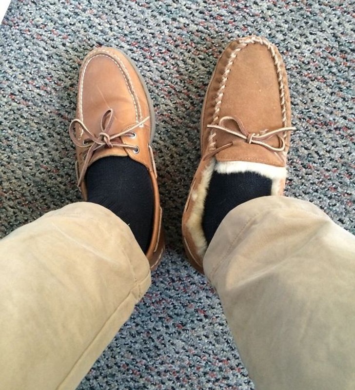 He did it mistakenly as the two moccasins resemble in color and design. The word moccasin belongs to the Algonquian language Powhatan, and since its origin, the term has been generalized to represent any kind of Native Indian sewn footwear.