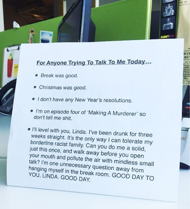He has made arrangements beforehand to avoid any useless and silly questions from his co-workers and even threatened them with the consequences if they asked him anything. Then he addresses his girlfriend only to warn her that he will hang himself if she tries to talk to him. The situation is grim, and we hope the rest of the day went well for all of them.