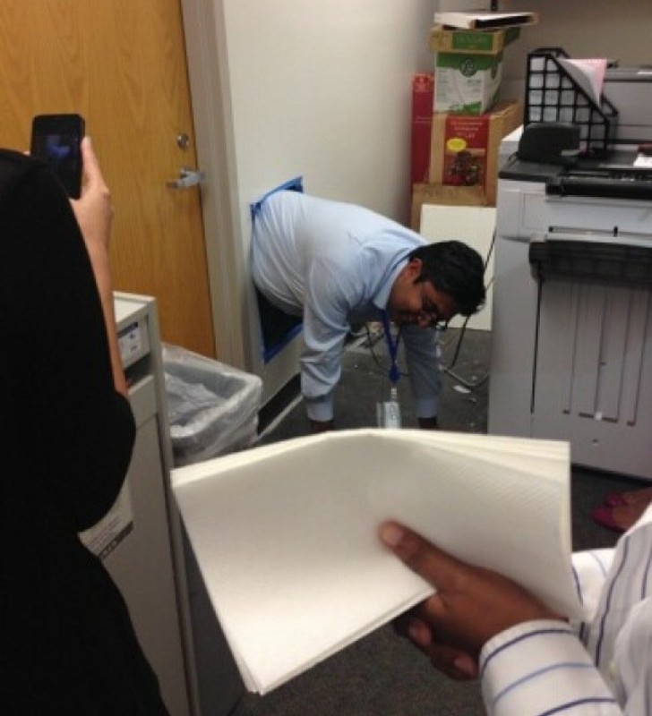 Every workplace has proper doors to everyone’s offices that should be used to communicate with co-workers. But the man in the picture seems awfully busy, and in wanting to save some extra seconds, he sought a newer way to speak to his colleagues. They must be astonished at this unexpected intrusion from the most surprising spot.