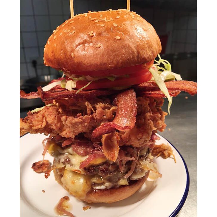 これをハンバーガーかそうでないと呼ぶべきかわかりません。いずれにせよ、このイギリスのハンバーガーは、世の中の他の全てのハンバーガーに期待するような作りとなっています。これは、マンチェスターの野心的シェフ、サム・ロングハーストが作りました。3つの違うタイプの肉を使用しており、一日に摂取するカロリーを一気に満たすように作っています。