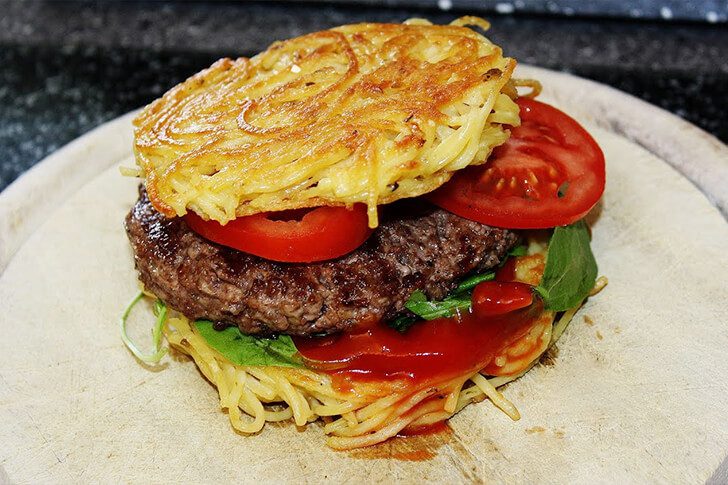 世界の最もクレイジーな食、ハンバーガー編! 挑戦してみたいかい? Share on Facebook 邪道に向かったイタリア グローバリゼーションは、人類の最大の成果となっており、その中に、このスパゲッティーバーガーを付け加えなければいけません。フィラデルフィアのPYTで作られたこの特別なレシピは、期待していた通りのものです。バンズをスパゲッティーの麺にして、ミートボールのイタリアンスパゲッティーをハンバーガーに変えます。 この肉のパテは、ミートボールと同じ味付けで、中にモッツァレラチーズを入れています。このハンバーガーは、アメリカ料理とイタリア料理の変なコンビの結果としてできたみたいですが、実際には世界中でニュースになったぐらい愛されたレシピなのです。 Prev Next Share on Facebook