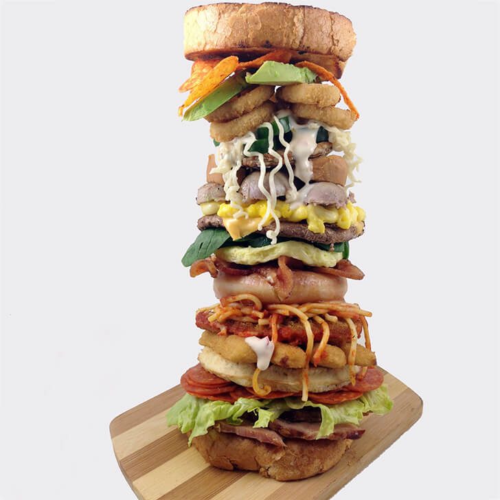 デュードゥフーズのニック・チャップマンが作ったアルファベットバーガーは、アボカドからズッキーニまで使った食べられる芸術作品です。文字通り、全てのアルファベットの文字からインスピレーションを受けており、言葉で表現された食材のリストは、ほんの数例を上げると、ハラペーニョ(Jalapeño)や、ガーリックブレッド(Garlic bread)、硬木質果の植物(xylocarp)などがあります。