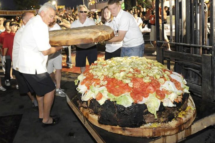 人類の野心には終わりがありません。しかし、777ポンド(約350kg)もある記録破りのハンバーガーは、行き過ぎなのでは。この野獣のようなハンバーガーは、2011年の夏にカリフォルニア州のアラメダ・カウンティ・フェアで作られました。不思議に思うかもしれないが、110ポンド(約50kg)の丸いパンがそこにあるのです!