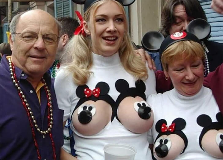 Cette photo montre l’un des hauts les moins appropriés pour un parc Disney. Après tout, il y a des enfants tout autour ! De plus, le parc Disney n’aurait jamais autorisé la fabrication de tels vêtements mettant en scène Mickey et Minnie de manière aussi suggestive. En réalité, il s’agit d’un collage de badges réalisé à la hâte.