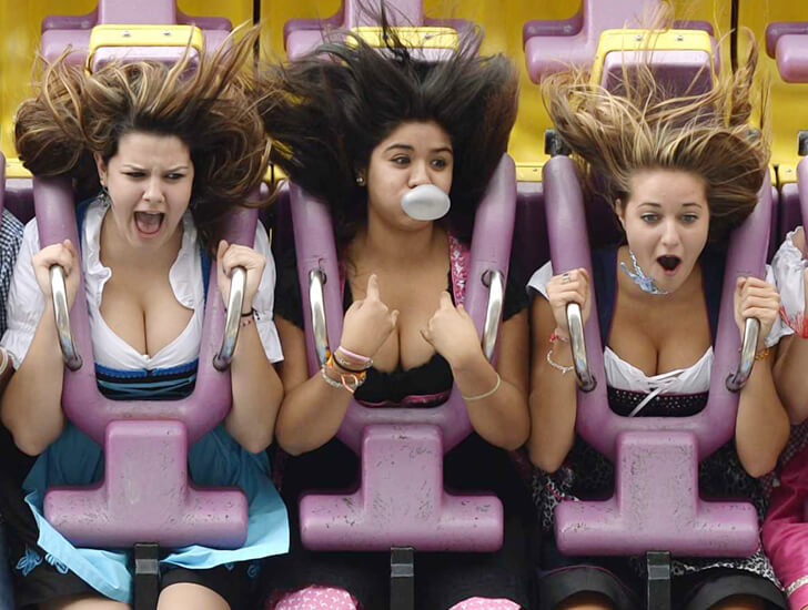 Le décolleté n’est cependant pas le plus surprenant de cette photo ! La question se pose en effet de savoir qui a autorisé cette jeune femme au centre à mâcher son chewing-gum sur les attractions Disney telles que Incredicoaster ou Rockin’Roller Coaster, où il y a de nombreux loopings ? C’est tout simplement irresponsable !