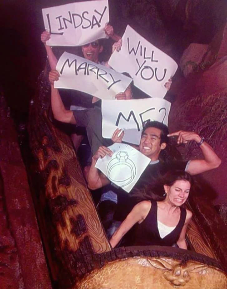 C’est certainement l’une des photos les plus mémorables prises à Splash Mountain. Selon la publication originale, Lindsay se trouvait à l’avant de la calèche, sans se douter de ce qui allait se passer. L’homme qui tient la bague est Chris, son petit ami. Tout s’est déroulé à la perfection : Lindsay a dit oui !