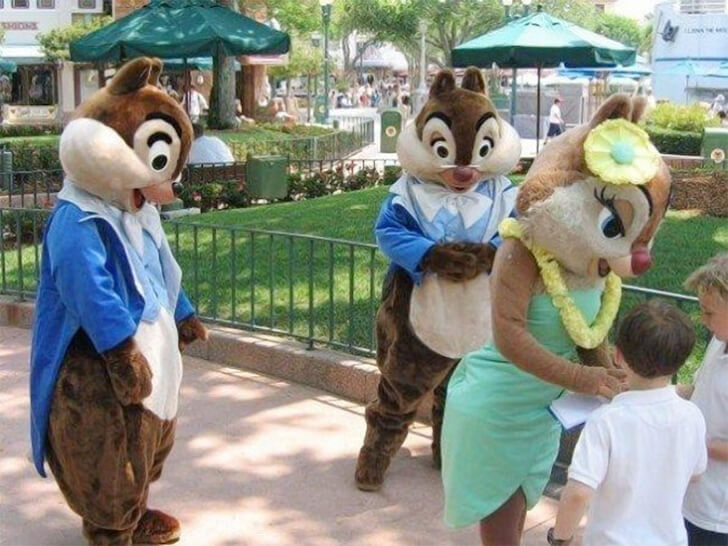 Tic et Tac ne semblent vraiment pas savoir se tenir en public ! Cette photo des mascottes de Tic, Tac et Clarisse paraît tout à fait normale au premier coup d’œil. En y regardant de plus près, on remarque cependant que les deux tamias ont les yeux fixés sur l’arrière-train de la charmante Clarisse.