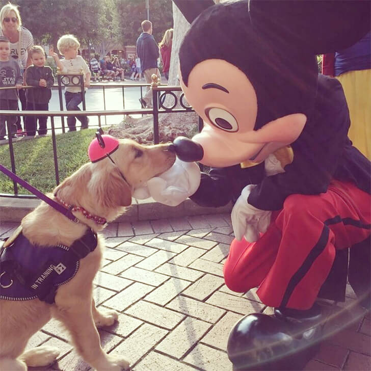 Il a même eu la chance de rencontrer Mickey Mouse, pour un moment inoubliable nez à nez ! Il semblerait que même les chiens d’assistance soient de fervents admirateurs des personnages de Disney. En arrière-plan, on peut voir la joie éclatante sur les visages des enfants, ravis de voir Mickey et le chien partager un moment aussi spécial et unique !