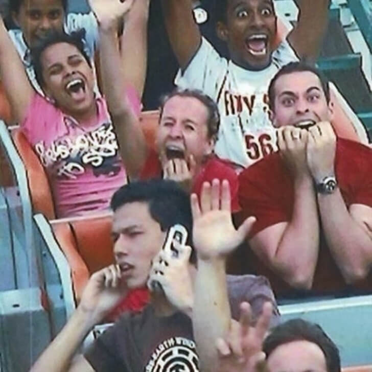 On se demande bien ce qu’il peut bien dire à l’autre bout du fil : « Salut, désolé de te déranger, mais je suis en plein cœur de Disney World et je ne peux pas parler trop fort. Oui, je vais bien, juste en train de profiter de cette incroyable montagne russe. »