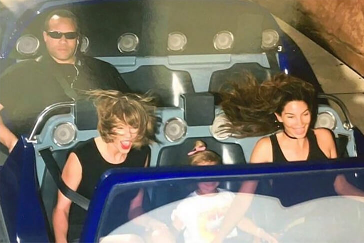 Si Swift et ses amis apprécient particulièrement l’attraction, leur garde du corps en arrière-plan ne semble pas perturbé. Malgré les montées, descentes et changements de direction des montagnes russes, cet homme robuste et costaud reste imperturbable.
