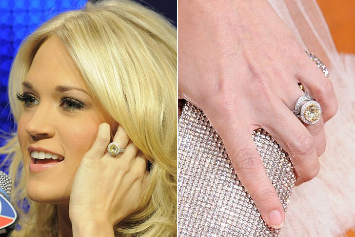 Underwood’s stone stands out mostly because of its yellow color, but that’s not all. Valued at $150K, this precious jewel features a platinum halo with pavé stones along its sides, making for a total of 12 carats worth of gemstones! Yellow gems are considered rare, making for just one out of every 16,500 carats mined.