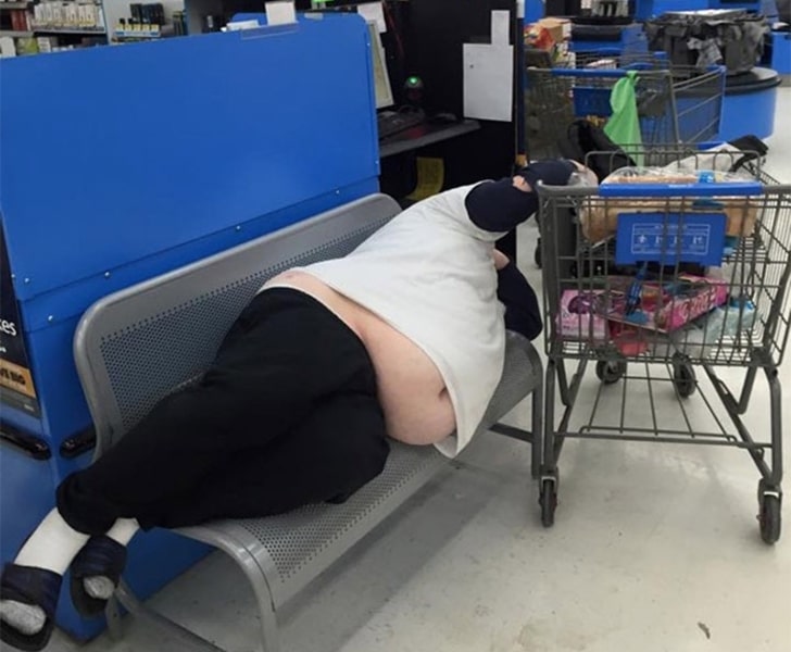 Da Walmart riesig ist, gibt es auch Zeiten, in denen es richtig geschäftig wird und du einige Zeit an der Kasse in der Schlange warten musst. Die meisten Menschen stehen wartend in der Schlange, während sie durch ihre Telefone scrollen, dieser Mann jedoch war zu müde, um dies zu tun. Glücklicherweise war neben ihm direkt eine Bank, die er dazu benutzt hat, sich auszuruhen. Er hätte sich einfach nur darauf setzen können, er entschied sich aber dazu, dass ein Nickerchen besser war. Es sollte nur sichergehen, dass er nicht in einen tiefen Schlaf fällt, ansonsten wacht er erst Stunden später auf.