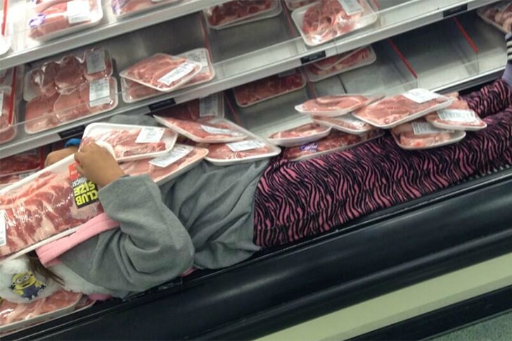 Das ist vermutlich das letzte Bild, das du jemandem schicken würdest, der eine fleischfreie Ernährung verfolgt. Dieses Mädchen liebt ihr Fleisch und es sieht so aus, als ob sie dachte, es würde einen guten Inhalt für ihr Bild geben, wenn sie sich in die Kühlung des Fleischfachs begibt. Sie hat sogar Fleischprodukte auf ihrem Körper verteilt.