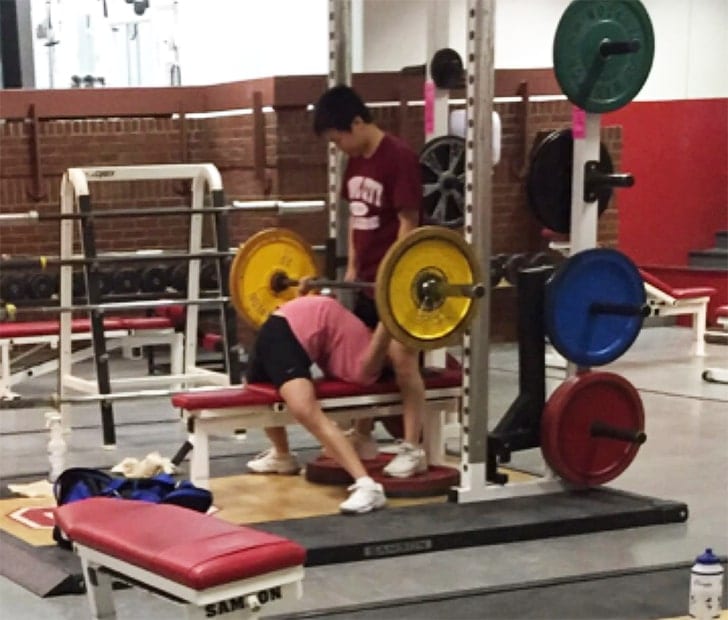 Das sieht nicht nach einer komfortablen Position zum Bankdrücken aus. Nicht nur, dass der Helfer nicht hilft, es sieht auch noch so aus als hätte er den Kopf des Sportlers mit seinen Beinen im Schwitzkasten. Der Sportler selbst sieht aus als hätte er sich beim Versuch, das Gewicht zu stemmen, den Rücken gebrochen. Aber dann würde sein Helfer vermutlich nicht so ruhig daneben stehen. Vielleicht sollte er einfach versuchen, nur die Stange zu heben. Er bringt beugt seinen Rücken bis zum Gehtnichtmehr. Wenn es ihm tatsächlich gut geht, müssen wir ihn für seine Beweglichkeit loben. Es sieht fast so aus als wäre er Teil einer Zirkusnummer.