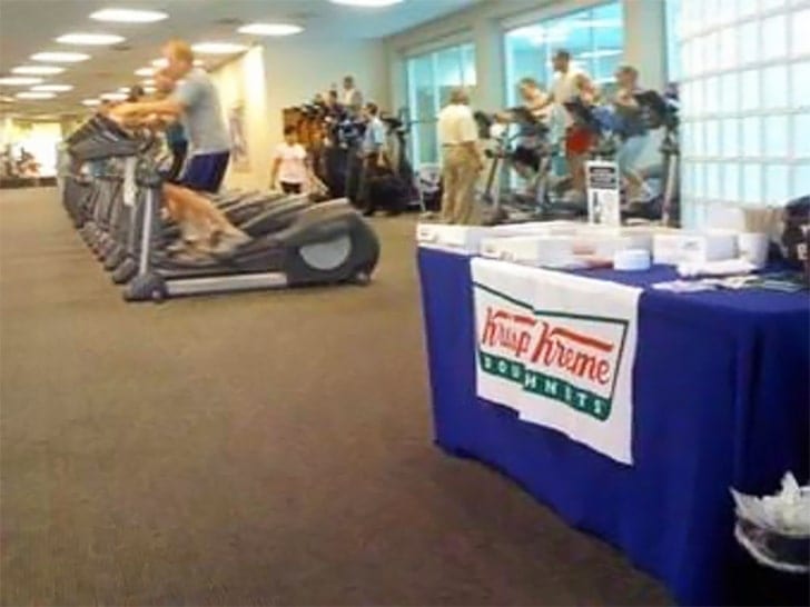 Krispy Kreme hat einen neuen Weg gefunden, seine Produkte zu bewerben. Eigentlich hätten sie genauso gut einen Donut ans Ende des Laufbandes legen können, um die Leute wie Kaninchen hinter Karotte, her rennen zu lassen. Was auch immer die Idee dahinter war, es scheint zu funktionieren: Das Fitnessstudio ist voll. Vielleicht ist es ja Teil eines Belohnungssystems, das von den Trainern festgelegt wurde. Wir sind jedoch nicht sicher, ob es seinen Zweck erfüllt. Wenn Krispy Kreme Donuts nicht gerade einen zucker- und glutenfreien Donut auf den Markt gebracht hat, wissen wir nicht, warum ein Donut-Stand und ein Laufband im selben Raum sein sollten.