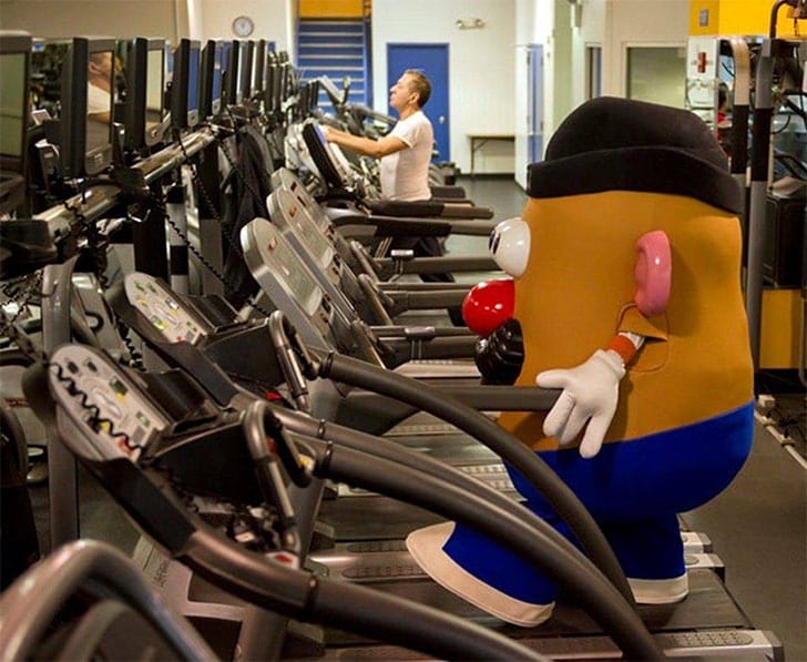 Dieses Bild hier ist das perfekte Symbol für den Spruch „Du bist was du isst“, und jeder, der schon einmal über eine Diät nachgedacht hat, weiß, dass Kartoffeln reich an Kohlenhydraten sind. Aber wir wissen natürlich nicht, ob dieser Kartoffelkopf hier letzte Nacht Pommes gegessen hat oder einfach eine Pause von seinem Dasein als Mr. Potato Head braucht. Aber wir sind sicher, dass es unglaublich schwierig ist, in so einem Aufzug auf einem Laufband zu laufen. Also ganz unabhängig davon, warum diese Person beschlossen hat, in einem Maskottchen-Kostüm ins Fitnessstudio zu gehen, sie hat definitiv ein anstrengendes Training und ein mega Bild.