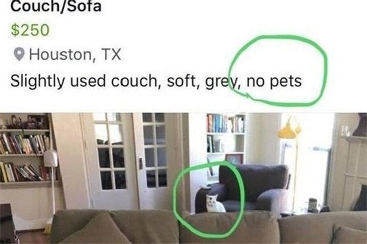 Ce vendeur a indiqué dans son annonce que le canapé vient d’une maison sans animaux de compagnie. Il n’a cependant pas réalisé que son chat s’était invité sur la photo. Les acheteurs potentiels se sont rapidement désistés en voyant l’image et on peut les comprendre. Le prix d’un canapé d’occasion ne vaut pas le désagrément d’en retirer des poils de chat.