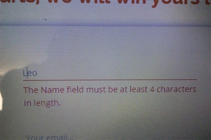 Le formulaire demande à ce que le prénom inscrit comporte au moins quatre caractères alors que son prénom, Léo, n’en fait que trois. Il peut néanmoins contourner le problème en utilisant le prénom de Leonardo, lequel est une version longue de Léo. Les personnes qui ont créé ce formulaire en ligne devraient aussi revoir les exigences concernant le nombre de caractères minimum.