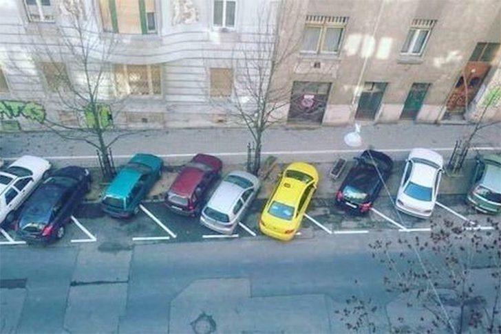 L’image ci-dessus a été capturée en Roumanie et montre a priori plusieurs voitures garées en méconnaissance des règles de stationnement. Les lignes blanches inclinées sur le bord de la chaussée sont cependant des marquages routiers hachurés et non des places de stationnement désignées.