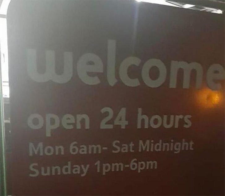 La photo ci-dessus illustre un cas flagrant de publicité mensongère. L’établissement est censé être ouvert 24 heures sur 24, mais il n’ouvre pourtant qu’à partir de 6 heures du matin le lundi et ferme à minuit le samedi. Il est aussi indiqué que le magasin n’est ouvert que de six à heures le dimanche.