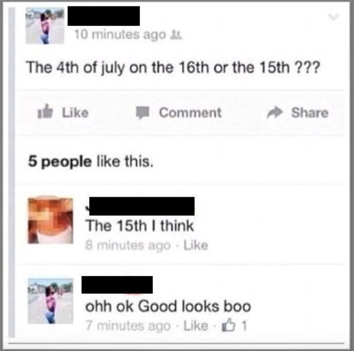 Ce statut Facebook n’aurait pas lieu d’exister si son auteur avait pris le temps de bien réfléchir avant de la publier. Elle s’est demandé si la fête du 4 juillet, jour de l’indépendance des États-Unis, était célébrée le 14 ou le 15 du mois. La réponse est pourtant indiquée dans le nom de la fête elle-même.