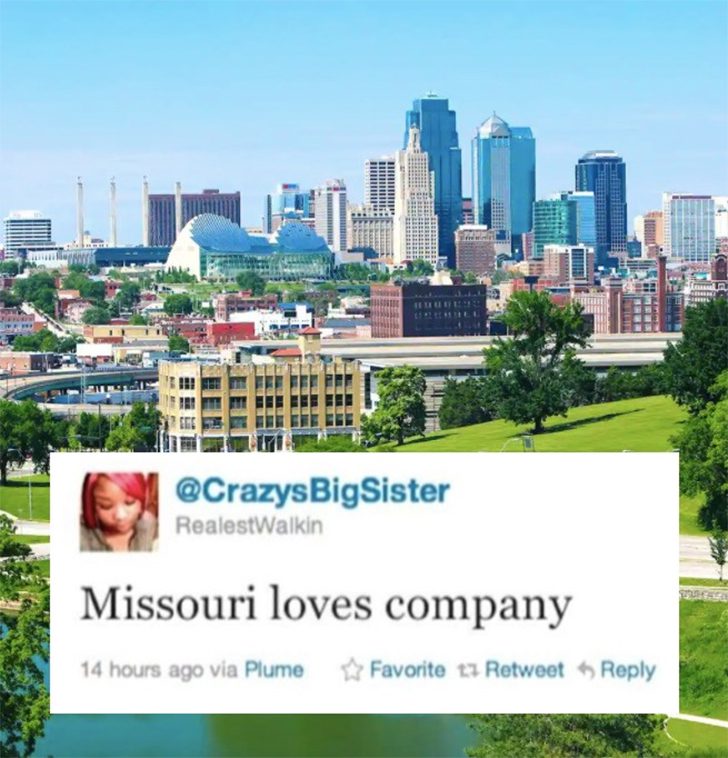 Il se peut aussi qu’elle soit plus intelligente qu’elle le laisse entendre, car la phrase « Missouri Loves Company » est le titre d’une chanson de Ringo Starr, l’ancien batteur des Beatles. Cette phrase a aussi été utilisée par l’auteur WJ Costello comme le titre de l’un de ses livres.