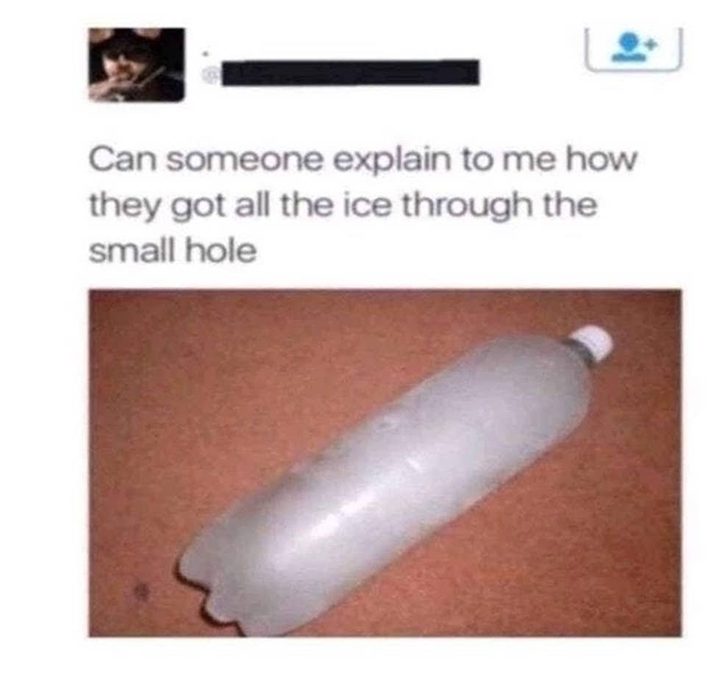 Il ne faut pas être un génie des sciences pour réaliser que l’image ci-dessus illustre la façon dont la glace se forme dans un congélateur. Un utilisateur sur Twitter a pourtant pensé qu’une personne très futée avait trouvé le moyen d’entasser tout un bloc de glace dans une bouteille en plastique.