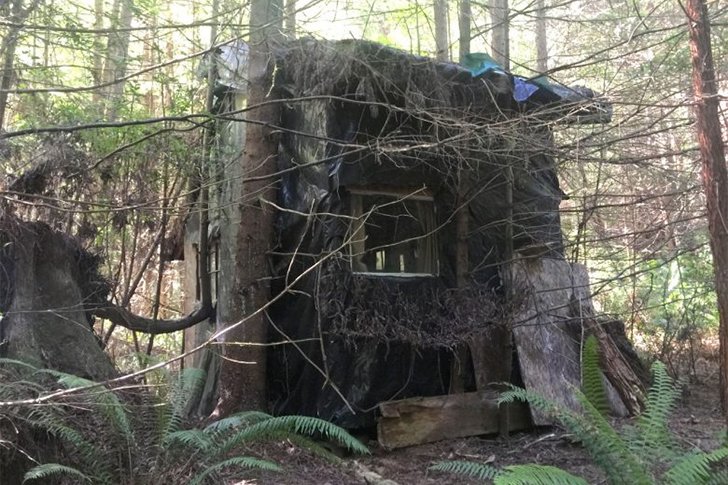 It was not clear how the person who built this cabin transported all of the heavy construction materials through the woods. There was nothing around the area that indicated there was a campsite in the vicinity. So, how did they do it? Mark observed the cabin and estimated that the dimensions of the structure were 8 by 12 feet and about 15 feet high. He was quite surprised to find out that the structure was built on a concrete foundation. There was also a peaked roof and a very small porch.