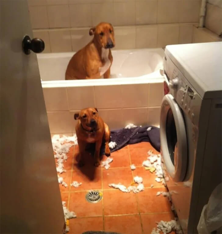Two brown dogs have crafted a masterpiece of shredded textiles in a bath and laundry room turned canine playground. One dog’s stationed in the tub as if awaiting applause, while the other lounges amid the chaos. Together, they’ve turned laundry day into a grand experiment in deconstruction.