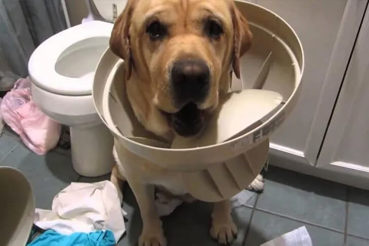 There’s a curious creature exploring new terrains like the domestic jungle’s porcelain paradise. This ambitious adventurer thought the bathroom trash held the secrets of the universe. But the price of curiosity was a trash-lid necklace. They say curiosity killed the cat, but here it trapped the dog.