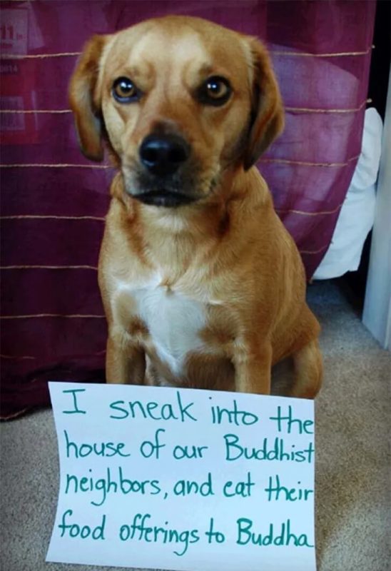 However, Buddha’s sanctified buffet seemed too tempting for our four-legged friend. While the gesture is sacred and profound for believers, our canine buddy might just see it as a heavenly spread meant for sneaky snacking. Maybe next time, a little enlightenment will come with his meal.
