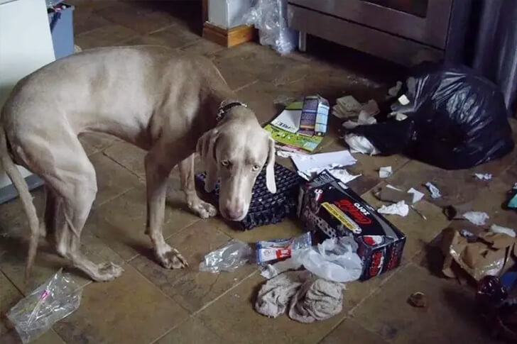 Caught in the act, a dog’s innocent eyes glance upward, surrounded by the spoils of a trashy expedition. This domestic explorer didn’t merely create a mess; it embarked on a culinary adventure. The trash-diving habit often stems from a dog’s natural scavenging instincts, driven by the tantalizing aromas of leftover food.