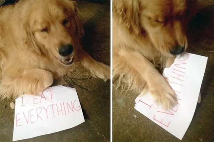 A dog with a reputation for devouring everything in sight has found itself in a peculiar situation. This time, the proof of its gluttonous behavior is laid out beside it on a piece of paper, declaring its relentless appetite. But true to form, even this evidence isn’t safe from the canine’s gnawing hunger.