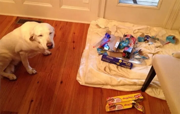 While most see a mess, our golden hero sees hours of play and maybe a little mischief. Surrounding this canine’s masterpiece is a scene of utter destruction, but who can stay mad when met with such a heartwarming, toothy grin? Sometimes, it’s about finding happiness in the chaos—and this dog is living that lesson to the fullest.