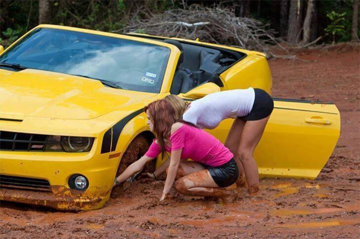 Die beiden hübschen Mädchen kehren mit ihrem luxuriösen Sportwagen, der tief im Schlamm steckt, auf diese Liste zurück, was ein wiederkehrendes Thema zu sein scheint. Dies ist eine andere Perspektive auf ihre verzweifelten Versuche, ihren Wagen zu befreien, zu denen auch das Graben mit bloßen Händen gehört. Sie versuchen es, aber ihre Methode ist unorthodox und möglicherweise nicht effektiv.