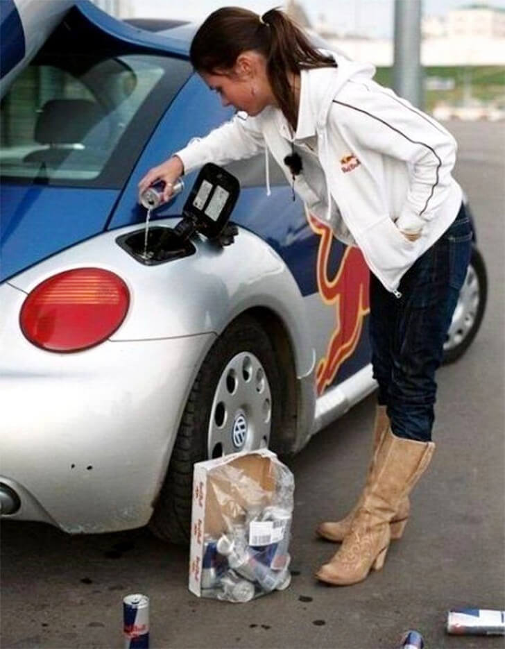 Dieses Mädchen hat uns mit ihrer Aktion den Witz des Jahrhunderts geliefert, vor dem sie gewarnt werden muss, auch wenn ihr Auto ein Red Bull-Fahrzeug ist. Auch wenn das Interesse an elektrischen und anderen alternativen Antrieben wächst, bleibt Benzin die wichtigste Energiequelle.