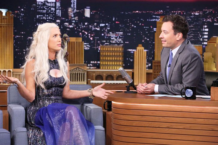 Any time one of Jimmy Fallon’s fellow Saturday Night Live alums makes an appearance on his show, the jokes get even better. Kristen Wiig’s performance as Khaleesi from “Game of Thrones” was one of the highlights of the night; she looked fantastic with her blonde wig, shimmering blue gown, and dragon perched on her shoulder.