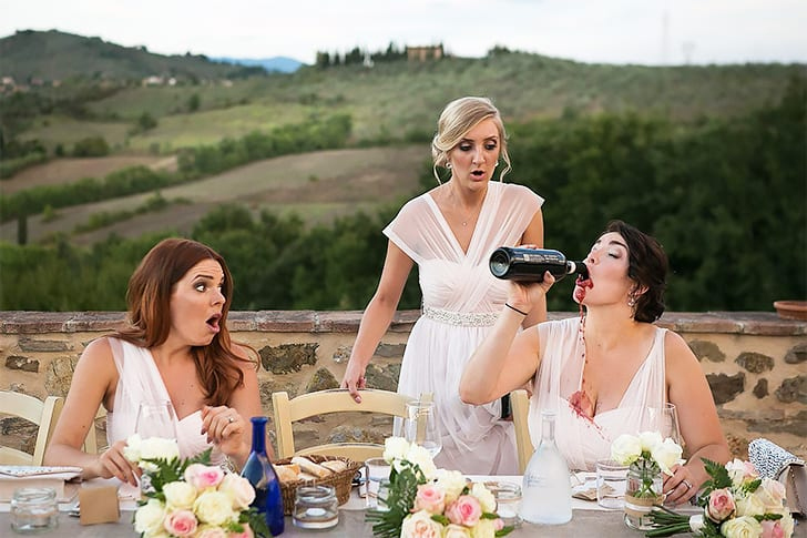 Although both white and red wines are advised to be served during wedding receptions, this lady may have forgotten her basic etiquette when she drank directly from a bottle. Worse, she chose the red drink, which could wreak havoc on her white attire. Good luck to her on removing the stain and explaining it to guests all night long.