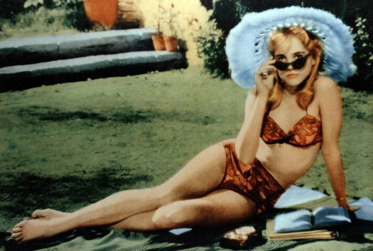Captured in a moment of youthful defiance, Sue Lyon, adorned in a brown two-piece bikini, iconic light blue wide-brimmed sunhat, and sunglasses, embodies the complex character of Lolita in the controversial 1962 blockbuster. She lowered her sunglasses sassily, and her portrayal sparked rumors and debates about the film’s themes.