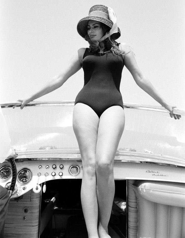Adorning a classic black full-piece bathing suit with a straw sun hat, Sophia Loren exudes timeless elegance aboard a boat in the 1961 film “Madame Sans-Gêne.” Her role as the spirited laundress turned duchess displayed her acting prowess and captivating beauty. With a career spanning decades, she’s received numerous personal accolades.