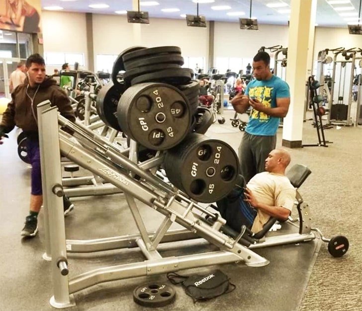 The thing about powerlifters and strong man competitors is that they are always pushing themselves to lift heavier. This of course is the currency of their trade, being able to lift heavy, pull planes, trucks, and other heavy items. But that doesn’t mean they have to stack a leg machine with this many plates.