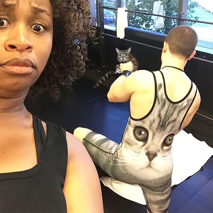 Something isn’t right here, and it certainly shows in this woman’s facial expression. Everything about this guy in the gym is messed up. The over-the-top cat leotard is one thing, but the way he is holding that cat, he is bound to piss a lot of people off in that gym… but wait a minute?