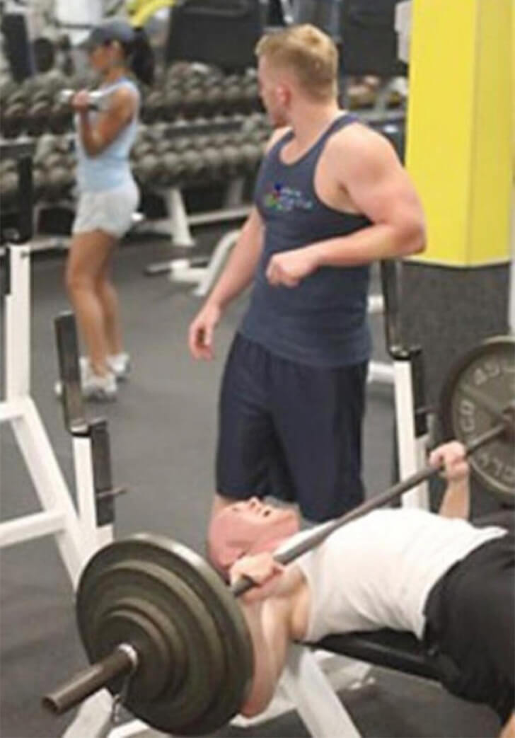 The result of this, dear reader, is that his friend is left struggling with a heavy weight on his chest, almost choking on the bar in the process. He shouldn’t be getting distracted like that, because his focus should be entirely on his partner’s progress, we’re sure he wouldn’t like it if his partner left him in such a situation.