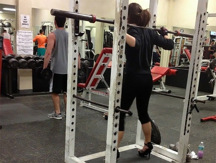 Remember the two people who tried using the leg press in a modified way? They could take some lessons from this woman, who is adding a great modification to her workout to challenge her body and make some extra gains. Wearing pumps at this place may seem like a minor change though.