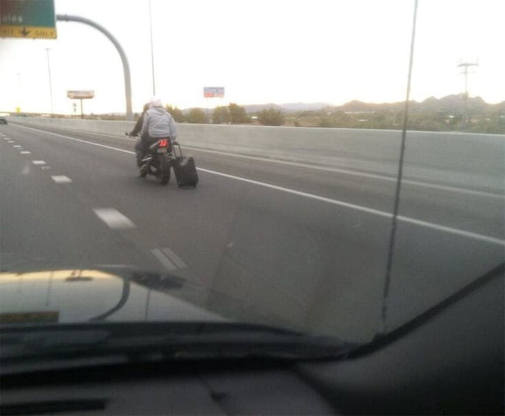 It looks like the only alternative available to carry this man, and his luggage was a motorbike. The concept appears brilliant in theory, but it could backfire if the bag loses its wheels. We can only hope they made it safe, but it’s not something worth trying at any time.