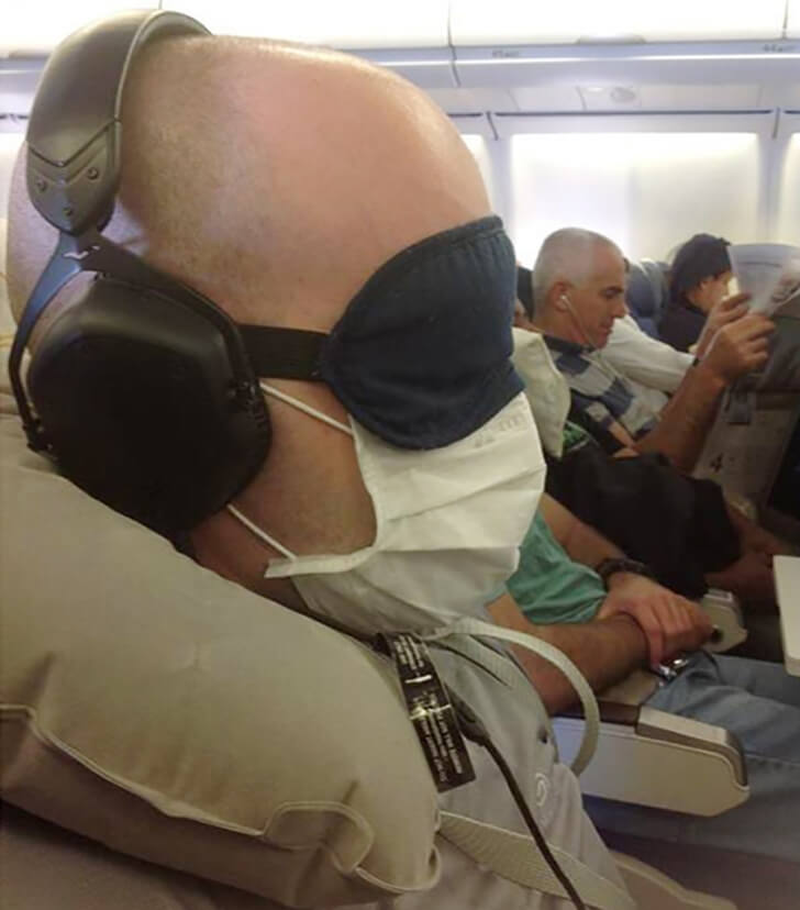 This man was not letting all that get to him. He came prepared with a mask, a blindfold to keep his eyes closed, and some headphones to shut off all the noise. It looks like he came prepared for a peaceful ride, so disturb him at your own risk!