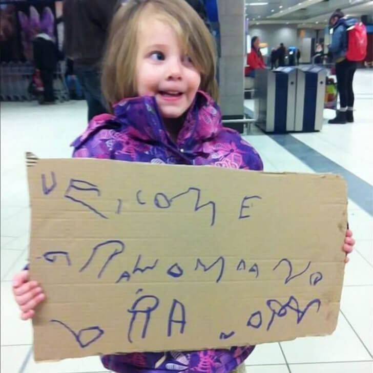 This picture of a young girl waiting for her grandparents at the airport is adorable. You can tell she’s excited from her face, and perhaps she couldn’t help but write a welcome sign. That’s where the problem comes in, though, as the sign was completely illegible. She looks proud nevertheless.