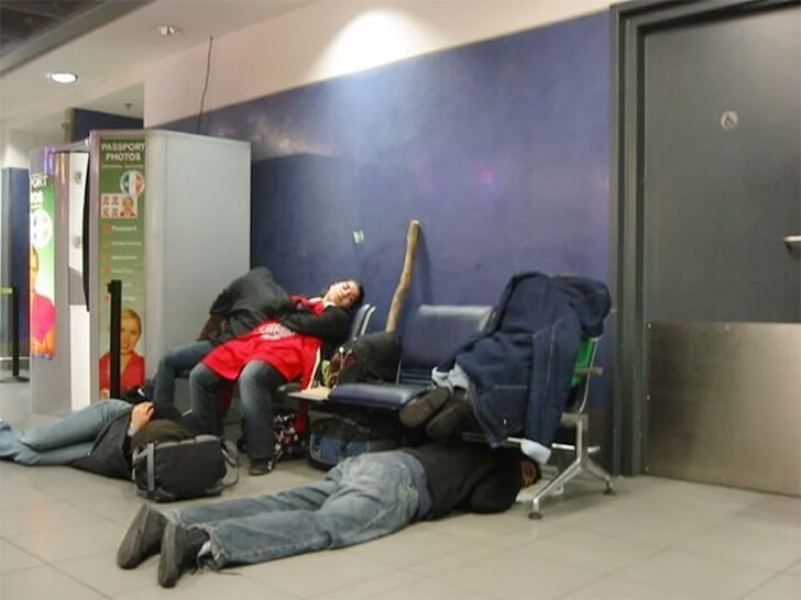 Although each one has their sleeping position, they seem to have perfected the art of guarding their luggage even in their sleep. You can’t help but wonder why they got stranded at the airport for such a long time. They should be careful lest they miss their flight.