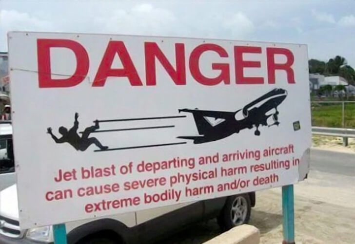 Airports are full of regulatory and warning signs, but this is rare. It was erected by the authorities at St. Maarten’s Princess Juliana Airport in New Zealand to warn unwary travelers to stay away from the runway. Perhaps it’s because the runway is too close to the airport parking lot.